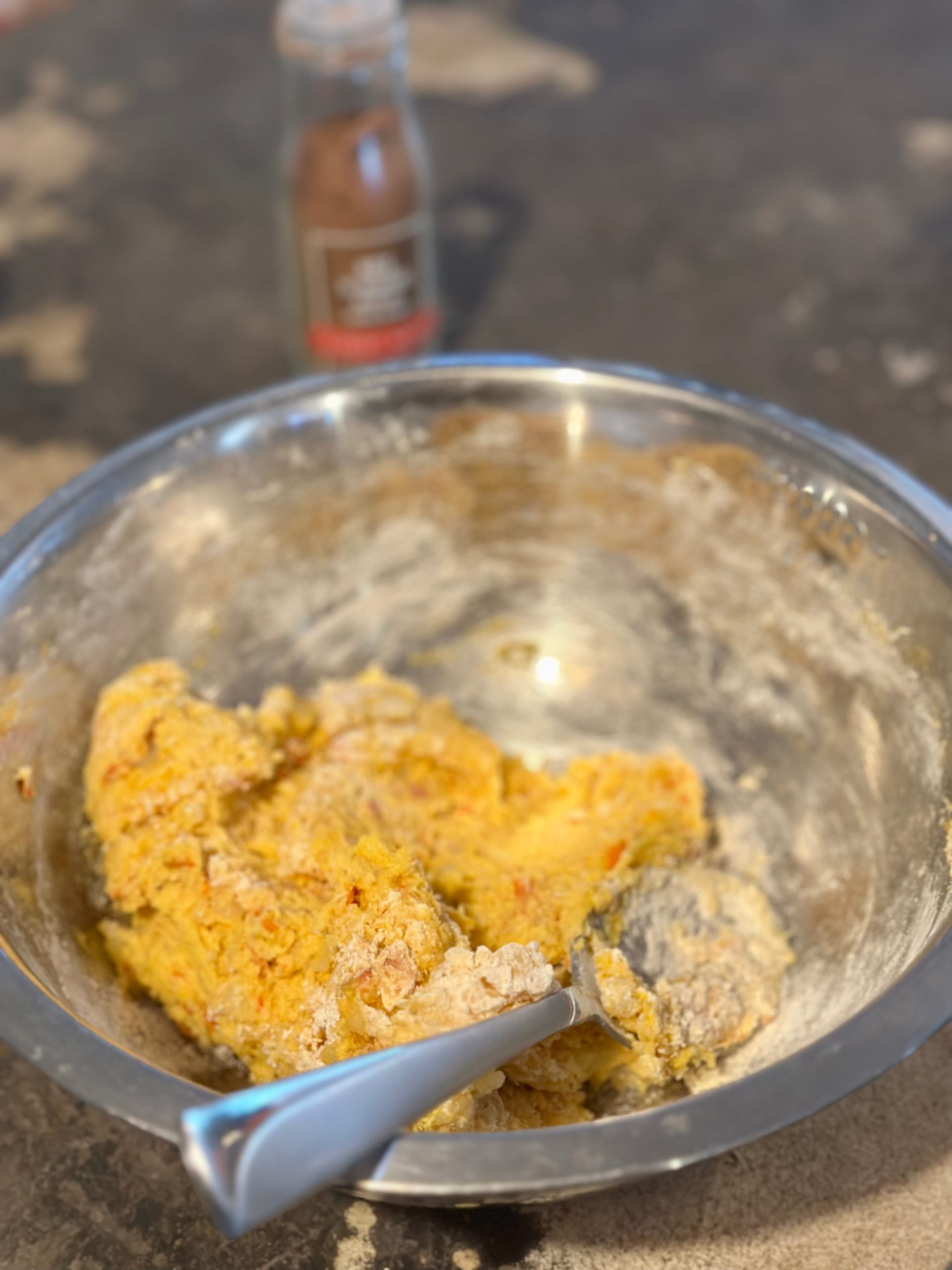 3. Mélanger la chair des patates douces, la purée de potiron, la farine et le sel. Pétrir juste assez pour obtenir une pâte homogène.
