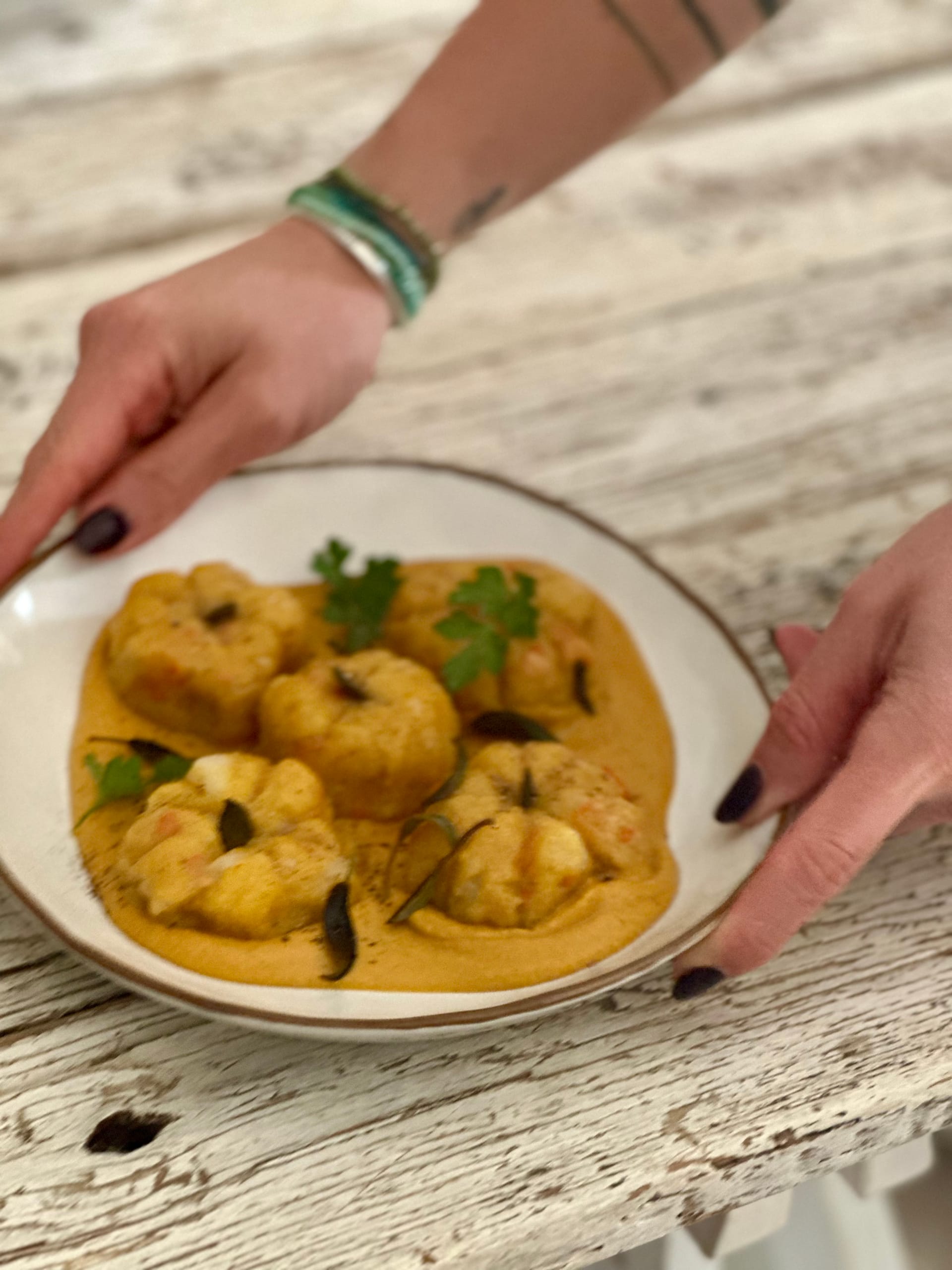 Servez les gnocchis bien chauds nappés de la sauce crémeuse au potiron. Dégustez immédiatement.