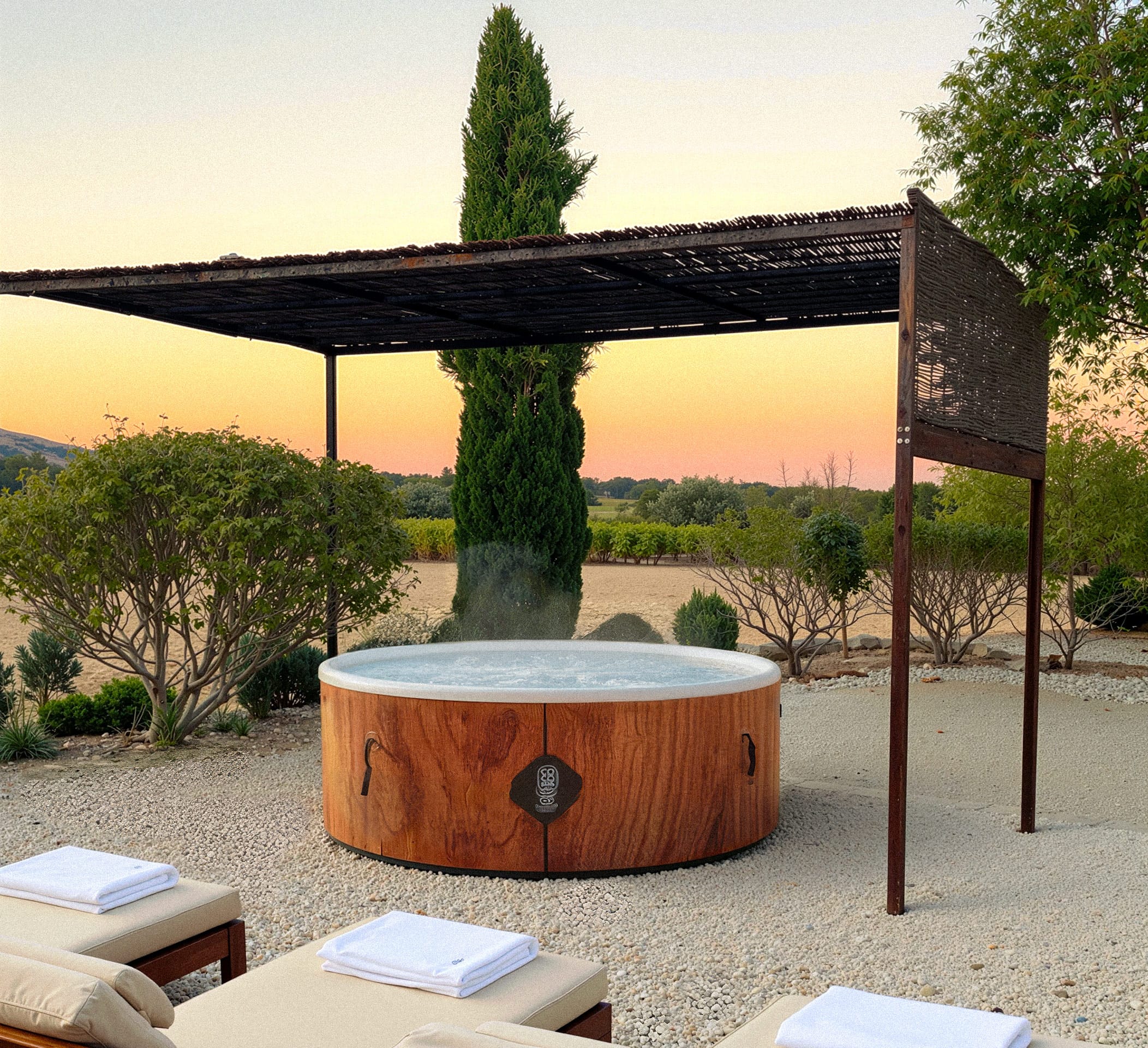 Beim Verlassen gelangen Sie zu einem große Terrasse wo Sie Ihre Mahlzeiten einnehmen und dabei den Blick auf den Luberon genießen können. Und nun wird dein Blick gelenkt durch unseren speziell für Sie gestalteten Entspannungsbereich, der Ihnen einen zeitlosen Moment bieten soll: privater Whirlpool, schattenspendende Konstruktion aus Kokosfasern, gemütliche Lounges.